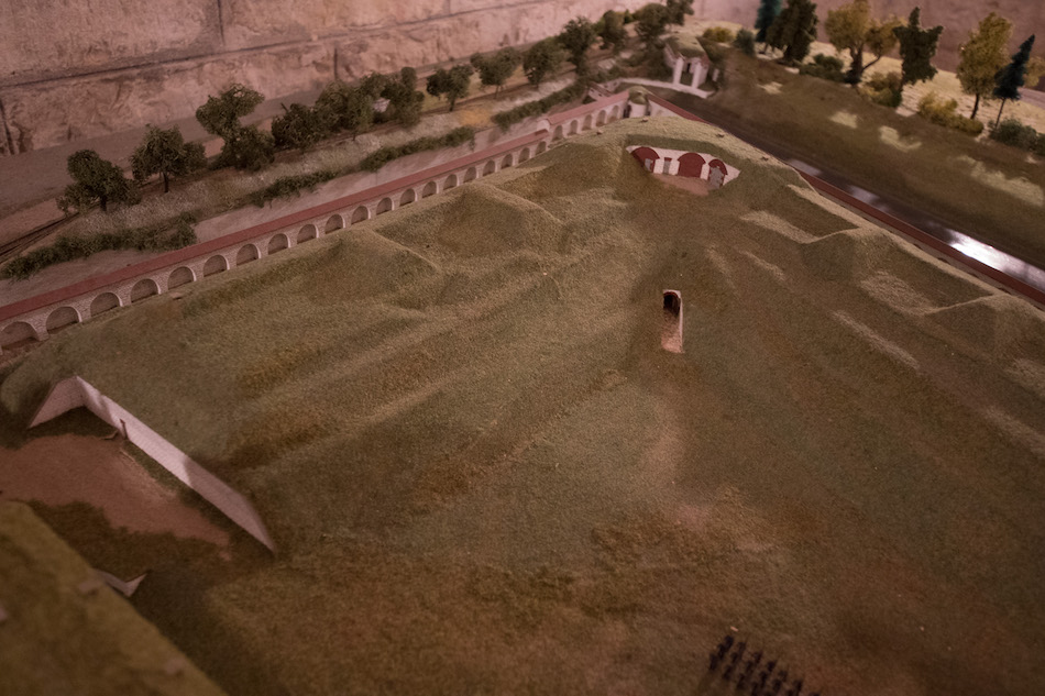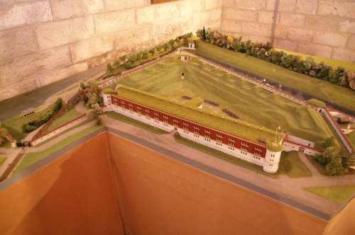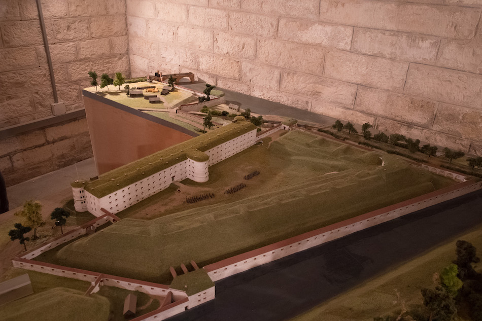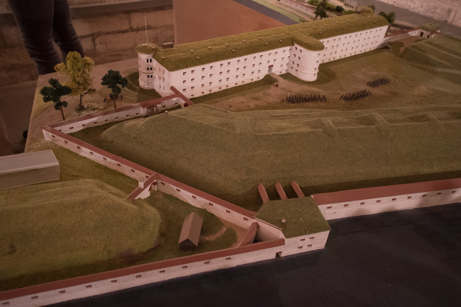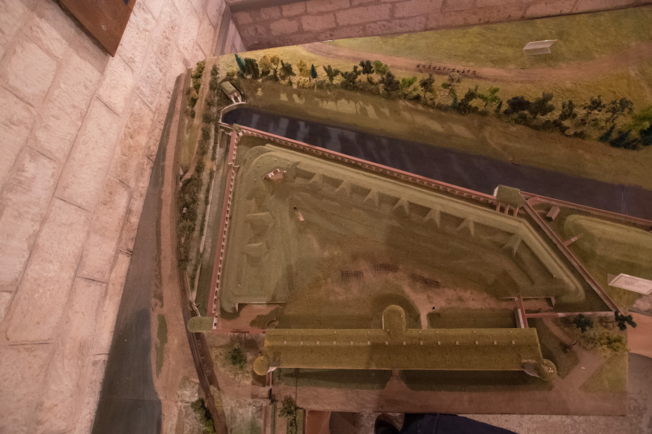 | Fotografie der Bastion um 1855: Zu sehen ist die linke Front und die Caponniere am Ende des Grabens |