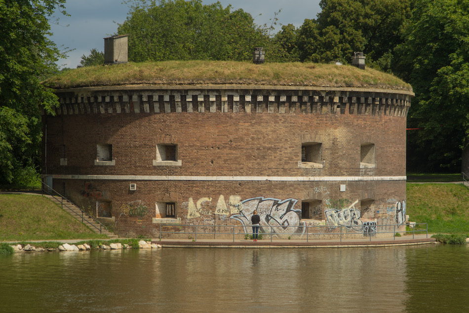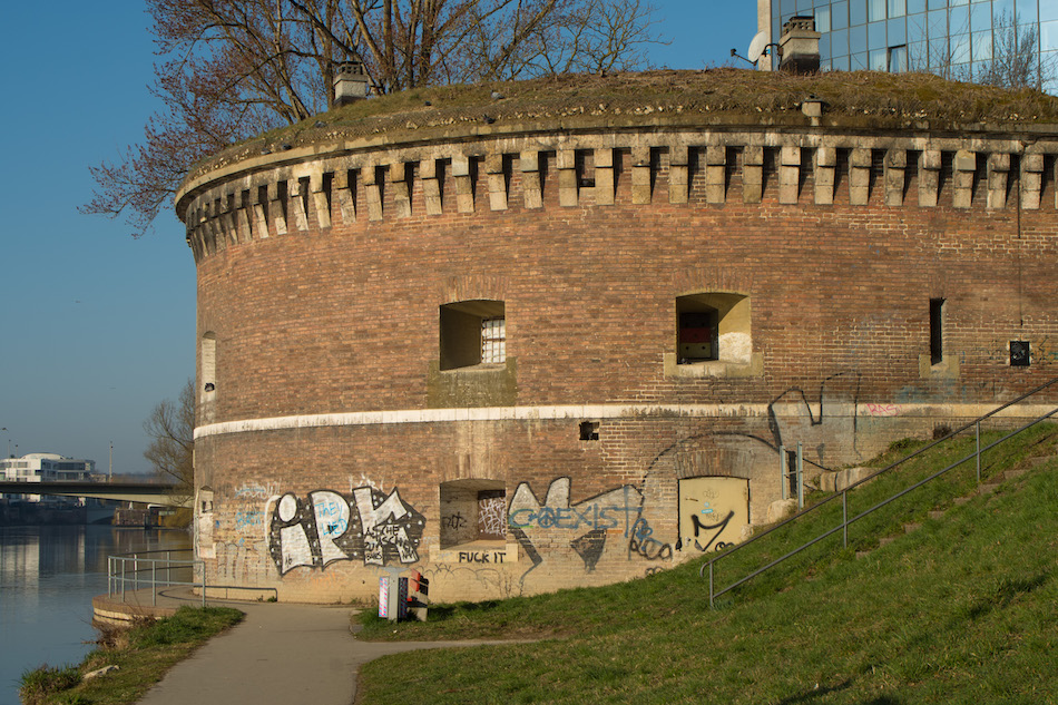 Der Geschützturm liegt direkt an der Donau am Valckenburgufer. Er wird heute von der