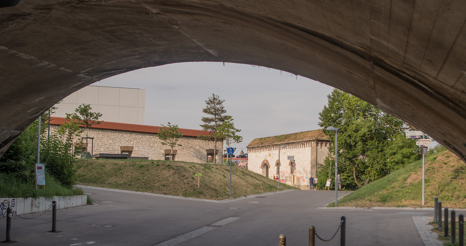 | Donauturm | Donauturm, Stadtseite | Blick unter der Sübahnbrücke durch zum Donauturm |
