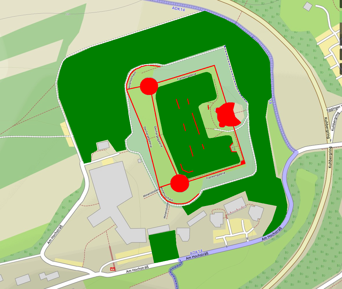 Contrescarpe, zwei Flankierungstürme und zwei Wurfbatterien an den