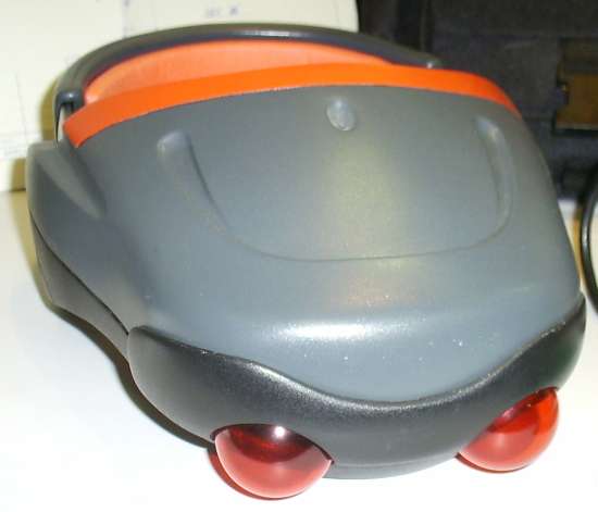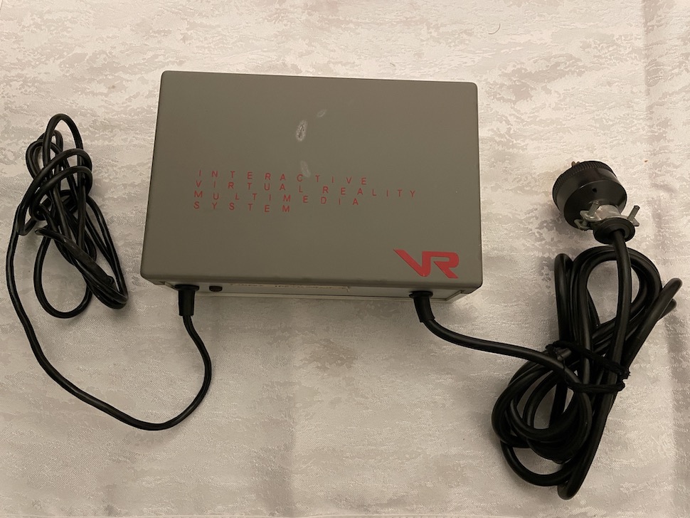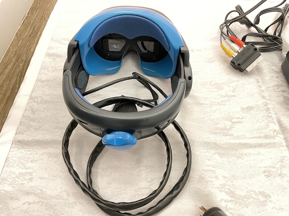 • Transmitter: Dieser wird an den linken Controlleranschluss der Konsole angeschlossen, ein weiteres Kabel führt zum AV-Ausgang der Konsole auf der Rückseite. Vom Transmitter aus gehen Kabel zum zweiten Transmitter, zum Headset und zum Bildschirm. An der rechten Seite sitzt der Lautstärkeregler. Der Transmitter benötigt eine eigene Stromversorgung, die aber auch die weiteren Komponenten mit Strom versorgt.