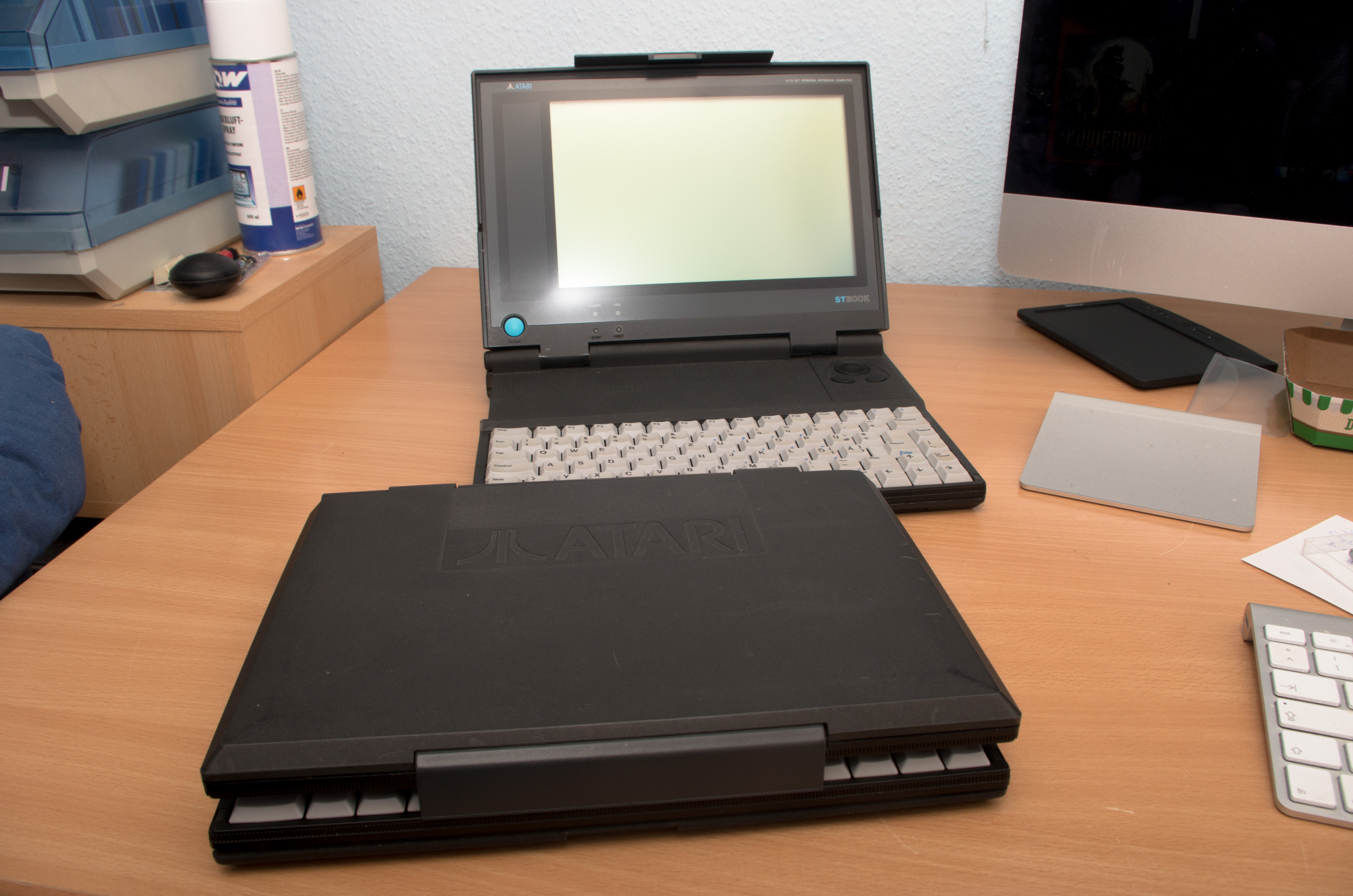 ST Pad, einem frühen Vertreter des Tabletcomputers. Im Gegensatz zu den vorhergehenden eher moderaten Aktualisierungen der ST-Modelle ging man hier recht radikale Wege. Alles für den Betrieb als Notebook nicht unbedingt Notwendige wurde weggelassen, darunter fielen zum Beispiel die Hintergrundbeleuchtung des Displays, das Diskettenlaufwerk und diverse Schnittstellen, alles andere wurde komplett überarbeitet. Eine stromsparende Version des 68000-Prozessors kommt hier zum Einsatz, ebenso eine 2½″-IDE-Festplatte. Display und Festplatte lassen sich mit Hilfe der Systemsoftware in den Ruhezustand versetzen. GLUE, Blitter und MCU wurden im sogenannten COMBO-Chip zusammengefasst, daneben besitzt das ST Book einen pseudostatischen Arbeitsspeicher, der die Daten auch nach dem Ausschalten behält. Als Betriebssystem kommt TOS 2.06 zum Einsatz, das um eine ROM-Disk und das Datenaustauschprogramm ST-Trans erweitert wurde. Durch diese Maßnahmen erreicht man eine Akkulaufzeit von fünf bis zehn Stunden, abhängig vom Arbeitseinsatz und der Umgebung. Erst im Februar 1992 erschien das ST Book schließlich auf dem europäischen Markt und kostete in Deutschland mit 3498 DM zwar um einiges mehr als ein wesentlich leistungsfähigerer