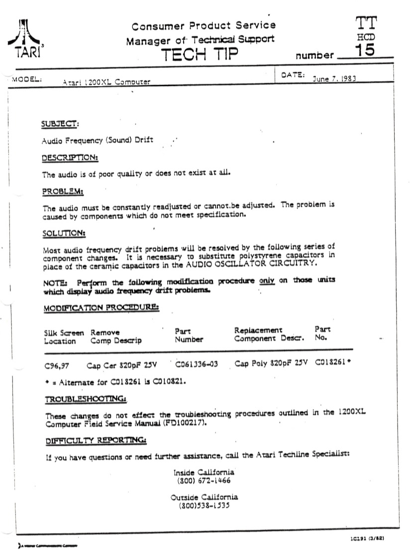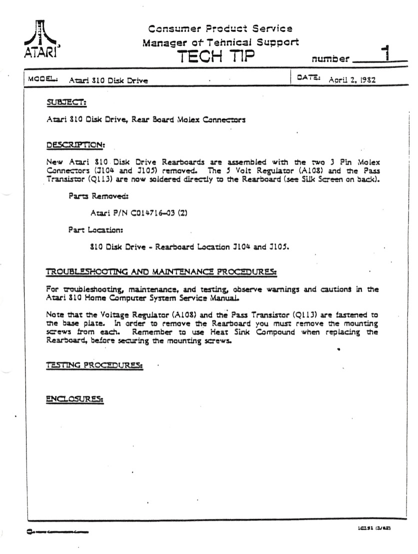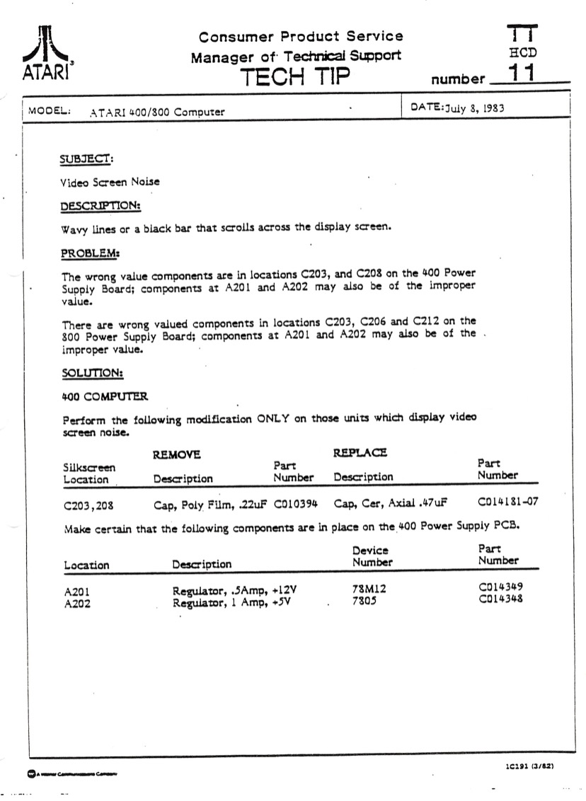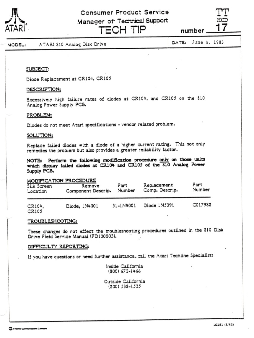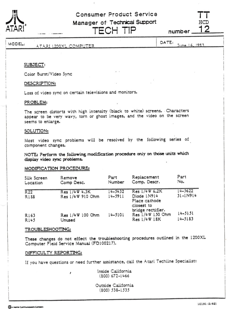 Atari Field Change Order 1 Atari Service Manual 1027 Atari 1050 Service- und Reparaturhandbuch Atari Tech Tip 1