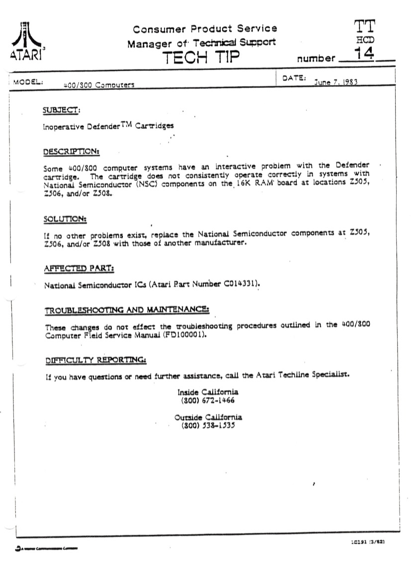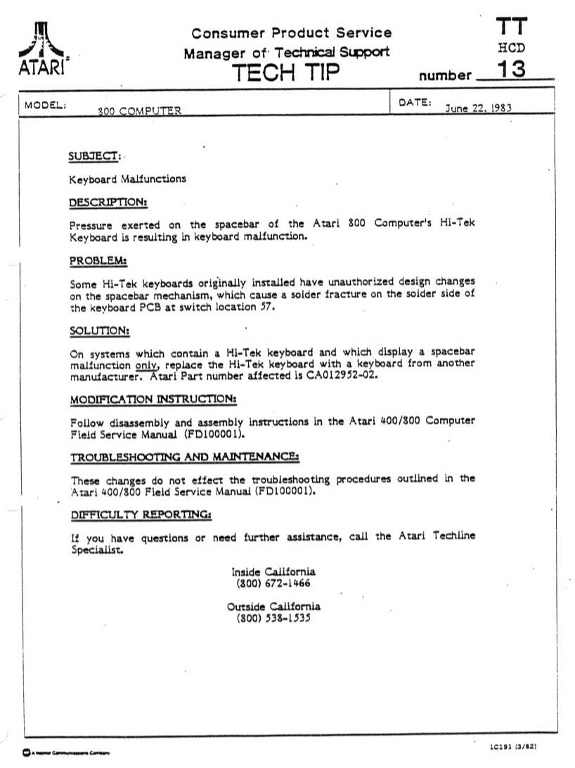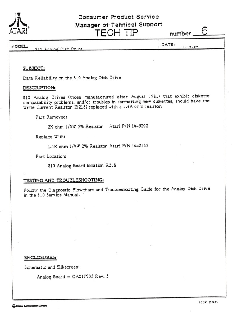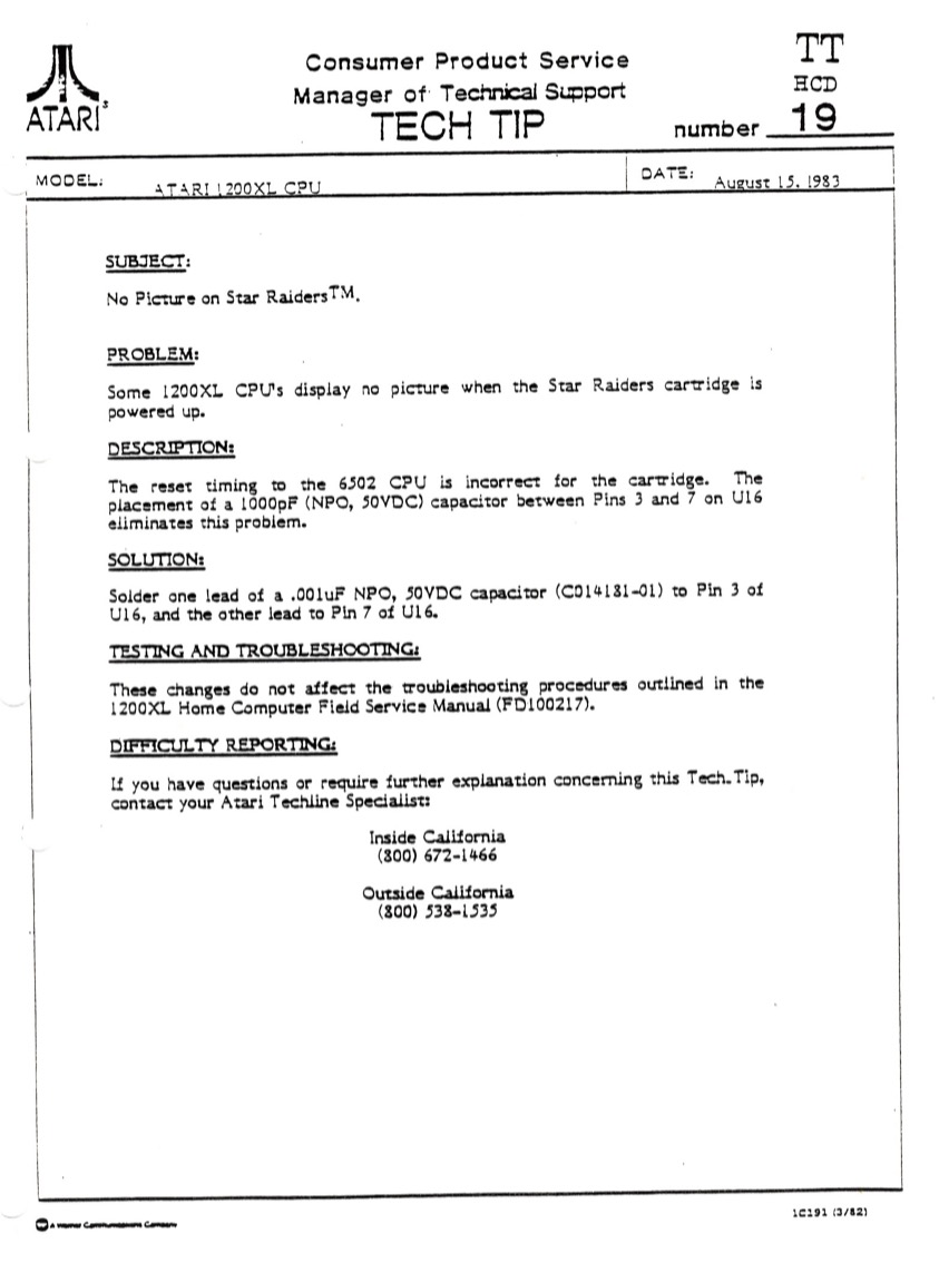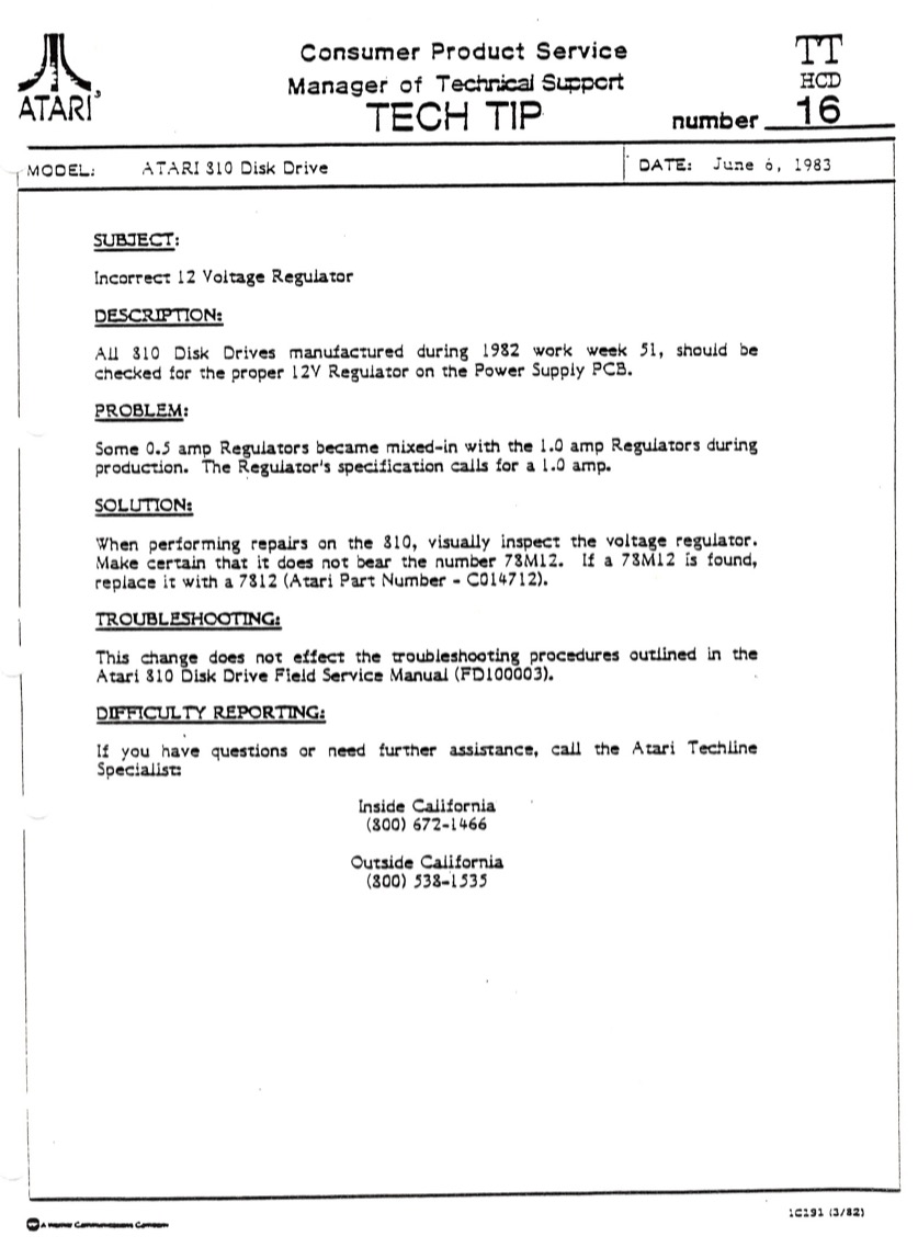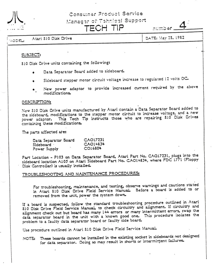 Atari Field Change Order 1 Atari Service Manual 1027 Atari 1050 Service- und Reparaturhandbuch Atari Tech Tip 1