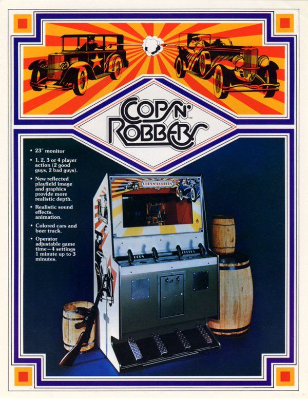 Choppers, the mob, gun molls and bootleg booze are back with new Cops n' Robbers. The good guys and the bad guys shoot it out at high speeds in the streets. A lead foot and a quick trigger finger. Each player steps on his own foot pedal to start the chase and accelerate his car. Realistic pistol grips with 7 continuous up and down positions provide maximum firing range. When an opposin car is hit it crashes to the bottom of the "street" out ouf sight. Press the foot pedal again, it reappears ready for another pass at blowing away the other guy. A beer truck driving up and down the middle of the street between opposing sides provides cover and challenges timing and accuracy. |