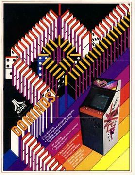 The Atari "Domino Effect": Higher earnings! All new Dominos pits one or two players against one another in a head-to-head battle of wits and strategy. Players control the direction of a simulated wall of dominos with a set of 4 instant-response push-buttons. Each player's wall starts out in one direction at opposite sides of the screen. The player progressively builds his wall by pushing the appropriate button (left, right, up or down) for the desired direction. The speed of play increses as the action progresses, adding to the challenge. A black domino set for one side, a white for the other reduces the possibility of a player watching the wrong wall. The object is to trap your opponent into running into your wall or his own. Precise timing and planning your moves in advance are the keys to winning. Dominos "fall" when opponent's wall is hit or player bumps into his own wall. |