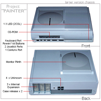 Painter, welches den Falcon-Computer und die Spielkonsole Jaguar zu einem Multimedia-System vereinigen sollte. Vorgesehen waren ein internes CD-ROM-Laufwerk mit nach oben öffnendem Deckel, ein Diskettenlaufwerk an der Vorderseite und drei Erweiterungssteckplätze mit Ausgang nach hinten. An der Vorderseite finden sich Anschlüsse für Tastatur, zwei Joystickports, ein ComLynx-Anschluss, Tasten zum Ein- und Ausschalten und zur Lautstärkeregelung und eine zweifarbige LED. Das Gehäuse ähnelt stark dem der Microbox und kann wie dieses vertikal oder horizontal aufgestellt werden. Die Hardware kam schließlich mehr oder weniger stark verändert in einigen Arcadespielen der Schwesterfirma Atari Games Corporation unter dem Namen