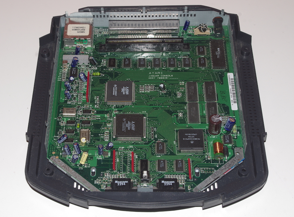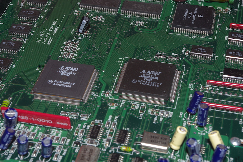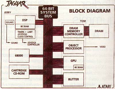 Jerry (Motorola SC414201FT). Tom wird mit 26,59 MHz getaktet und enthält den Grafikprozessor samt 4 kB Arbeitsspeicher und einem erweiterten Befehlssatz für 3D-Anwendungen, den 64-Bit-Blitter, der Hochgeschwindigkeits-Logikoperationen, Z-Buffering und Gouraud-Shading unterstützt, den 64-Bit-Objektprozessor, der seine Befehle direkt vom System erhält und daher nicht programmiert werden kann, sowie den DRAM-Controller. Jerry, ebenfalls mit 26,59 MHz getaktet, beinhaltet den 32-Bit-DSP samt 8 kB internem Arbeitsspeicher, dieser kann Sound in Beinahe-CD-Qualität ausgeben. Die Anzahl der Audiokanäle wird hierbei allein durch die Software festgelegt. Zwei Stereo-DACs wandeln digitale Daten in analoge Tonsignale um. Der DSP unterstützt zudem Wavetable Synthesis, FM Sample Synthesis und AM Synthesis. Daneben beinhaltet Jerry noch den Universal Asynchronous Receiver Transmitter (UART), einen Clock Control Block, diverse Timer und ihm obliegt die Kontrolle der Eingabegeräte.
