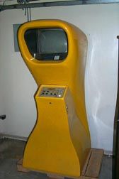 BEAUTIFUL SPACE-AGE CABINET attracts players of all age groups. The player is additionally attracted by two flying saucers moving about in formation on the playfield while the unit is in its non-activated state.