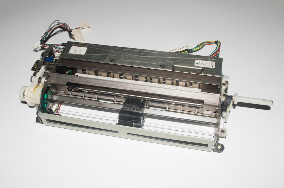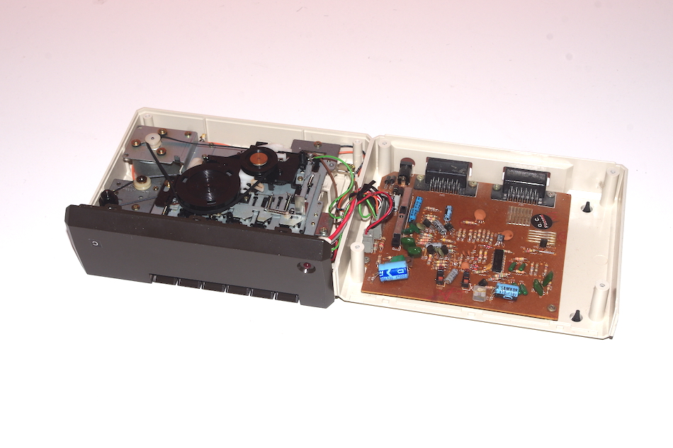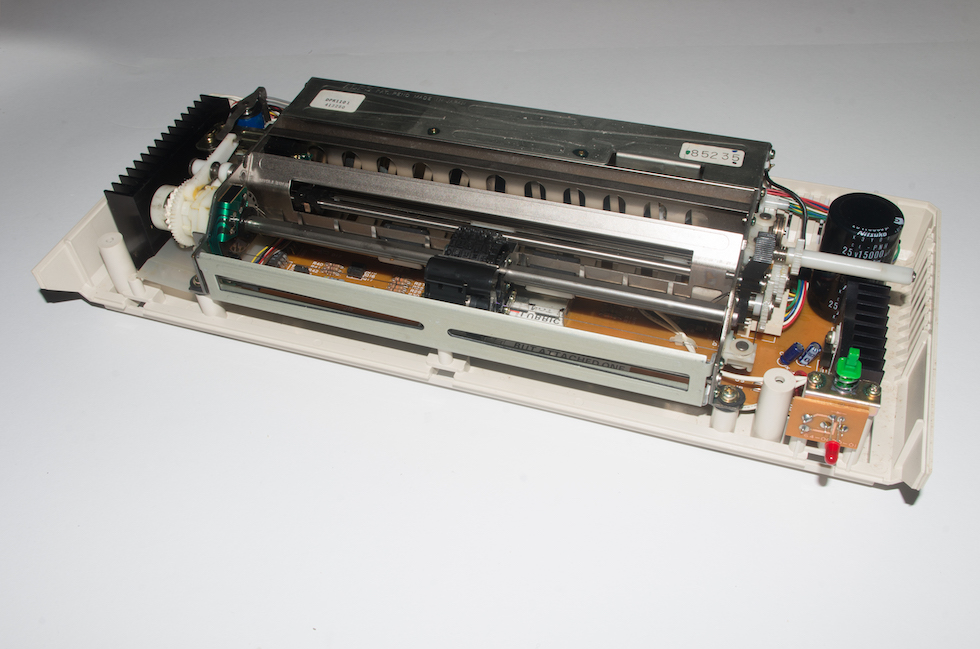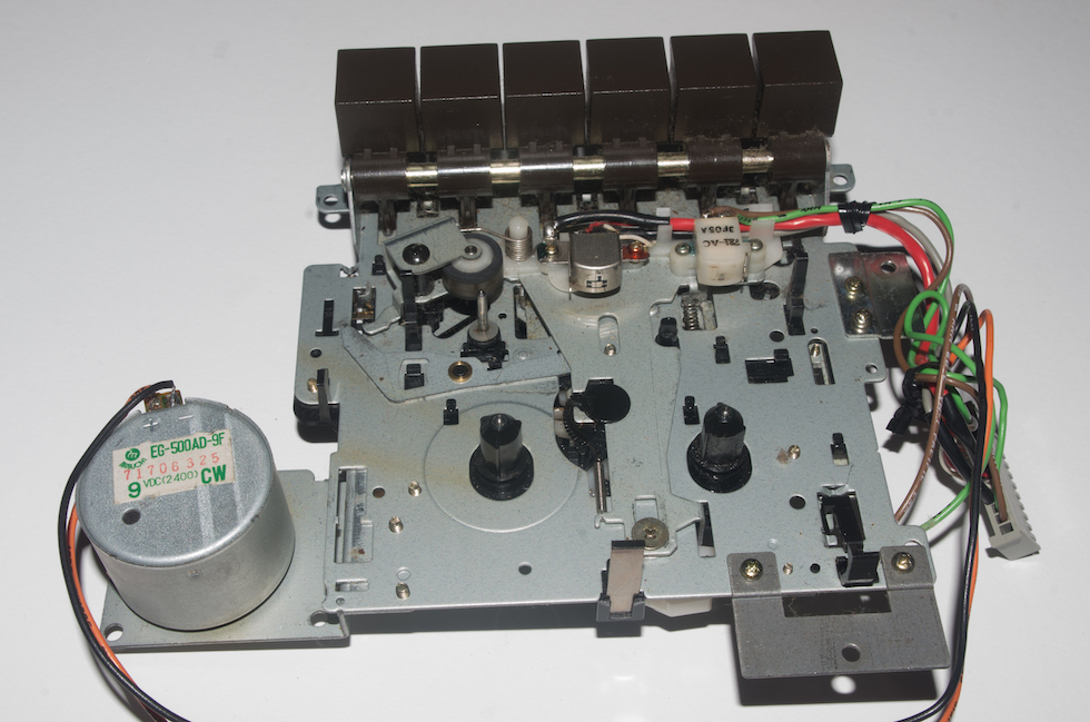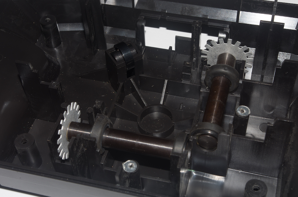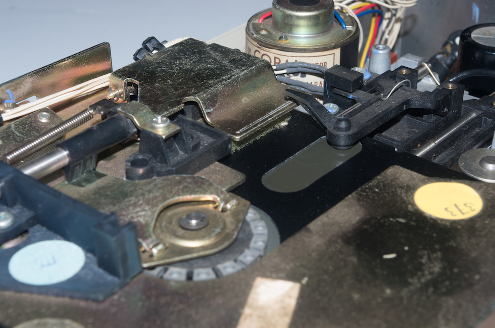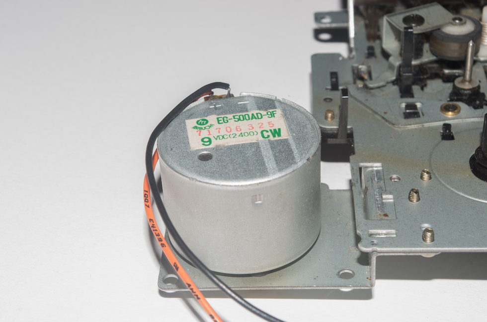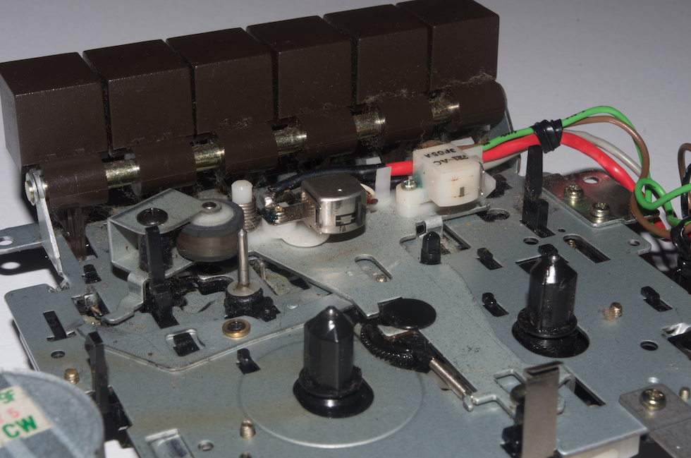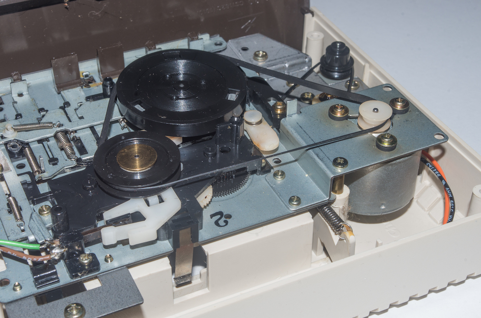Im Inneren befinden sich zwei Gummiriemen, die mit der Zeit ausgetauscht werden müssen – über den größeren Riemen wird das Laufwerk selbst über den 9V-Motor angetrieben, der kleinere verbindet einen der Wickeldorne mit dem Zählwerk. Welche Riemen im Falle eines Falles benötigt werden, hängt vom jeweiligen Laufwerkshersteller ab. Für Chelco-Laufwerke passen die Riementypen FC100228 (Motor) und FC100229 (Zählwerk), für Sanyo-Laufwerke die Typen FC100250 (Motor) und FC100251 (Zählwerk). Um festzustellen, welche Version man besitzt, lohnt ein Blick aufs Typenschild. Ist dort ein dunkles Etikett mit der FCC-ID