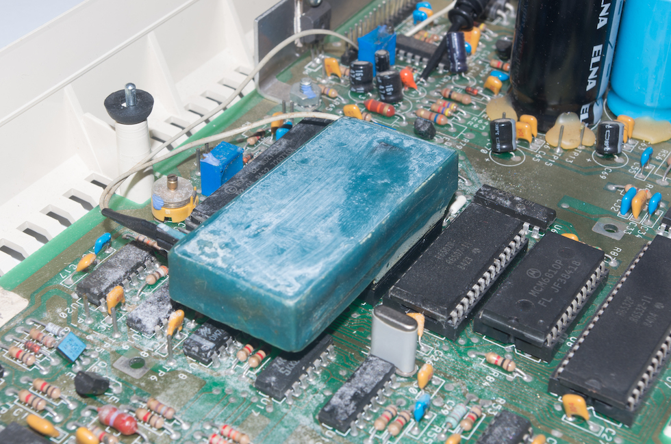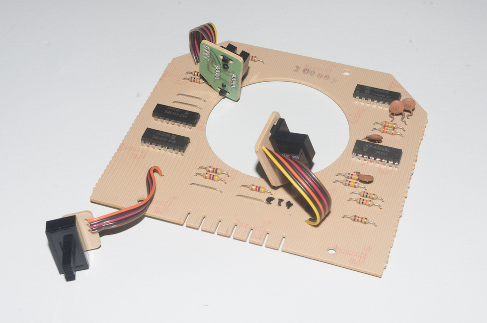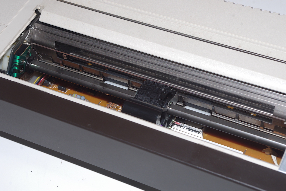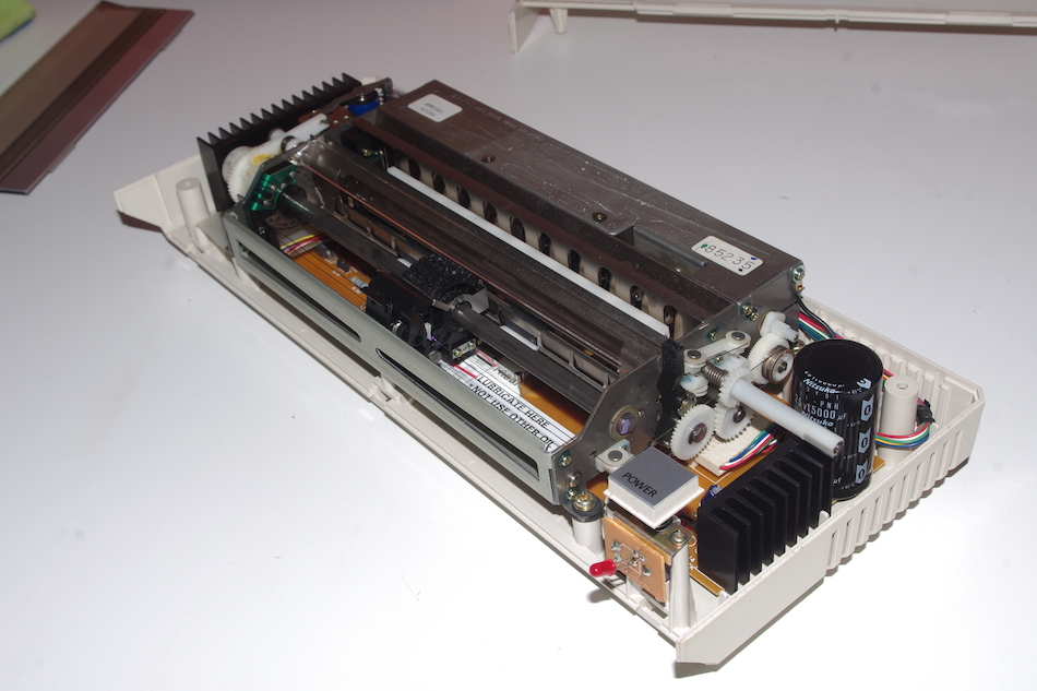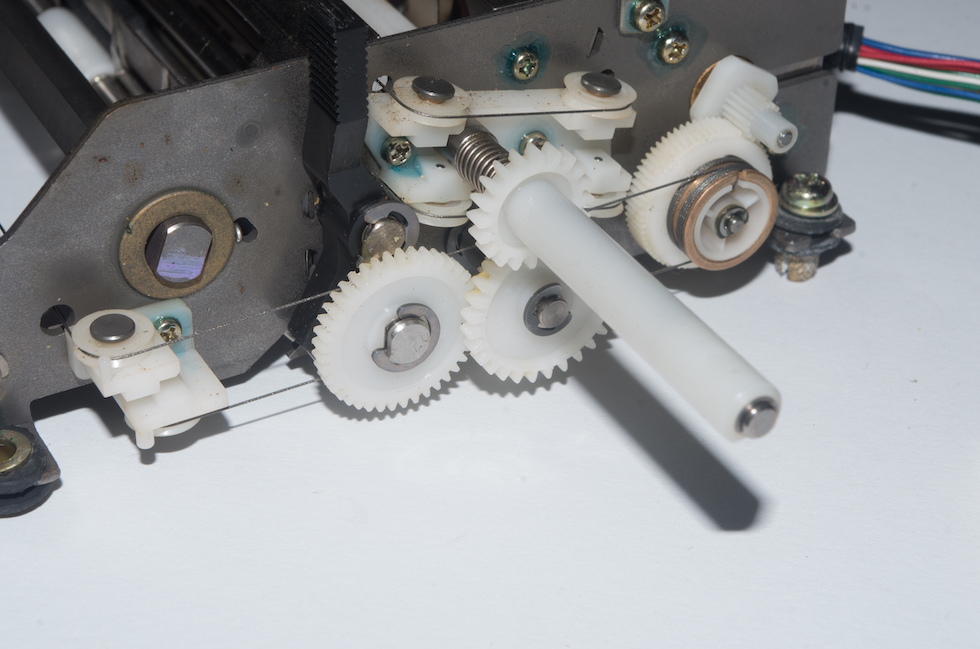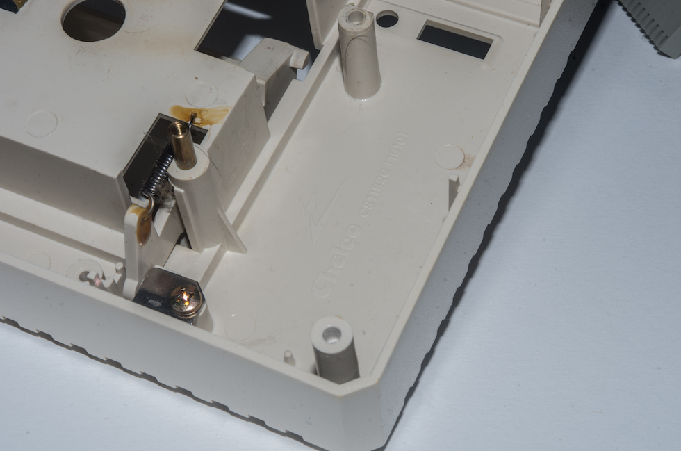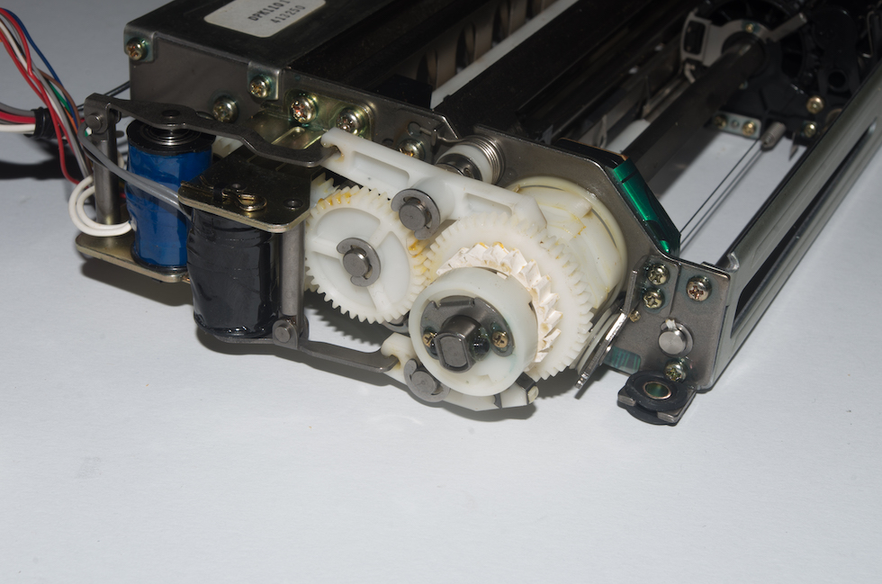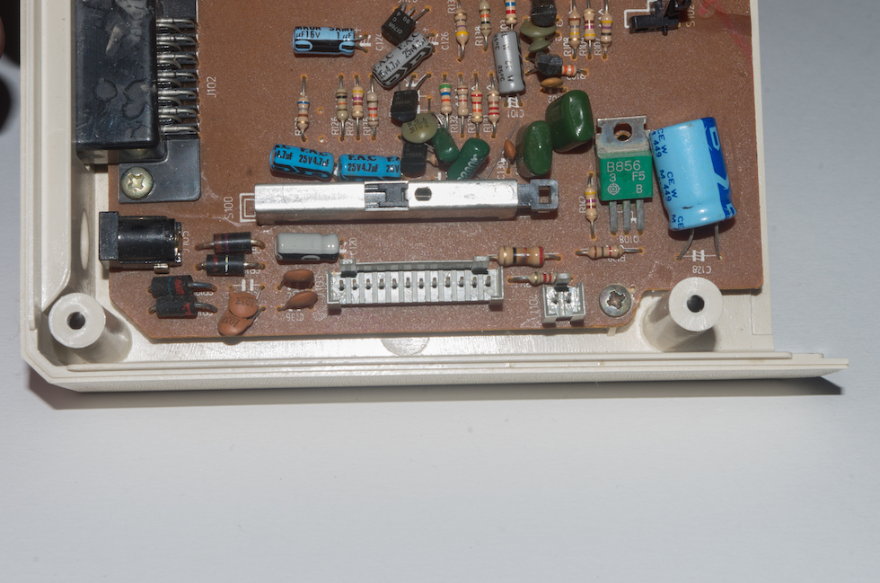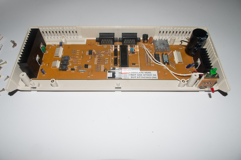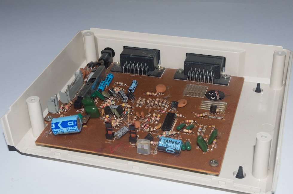 Im Inneren befinden sich zwei Gummiriemen, die mit der Zeit ausgetauscht werden müssen – über den größeren Riemen wird das Laufwerk selbst über den 9V-Motor angetrieben, der kleinere verbindet einen der Wickeldorne mit dem Zählwerk. Welche Riemen im Falle eines Falles benötigt werden, hängt vom jeweiligen Laufwerkshersteller ab. Für Chelco-Laufwerke passen die Riementypen FC100228 (Motor) und FC100229 (Zählwerk), für Sanyo-Laufwerke die Typen FC100250 (Motor) und FC100251 (Zählwerk). Um festzustellen, welche Version man besitzt, lohnt ein Blick aufs Typenschild. Ist dort ein dunkles Etikett mit der FCC-ID