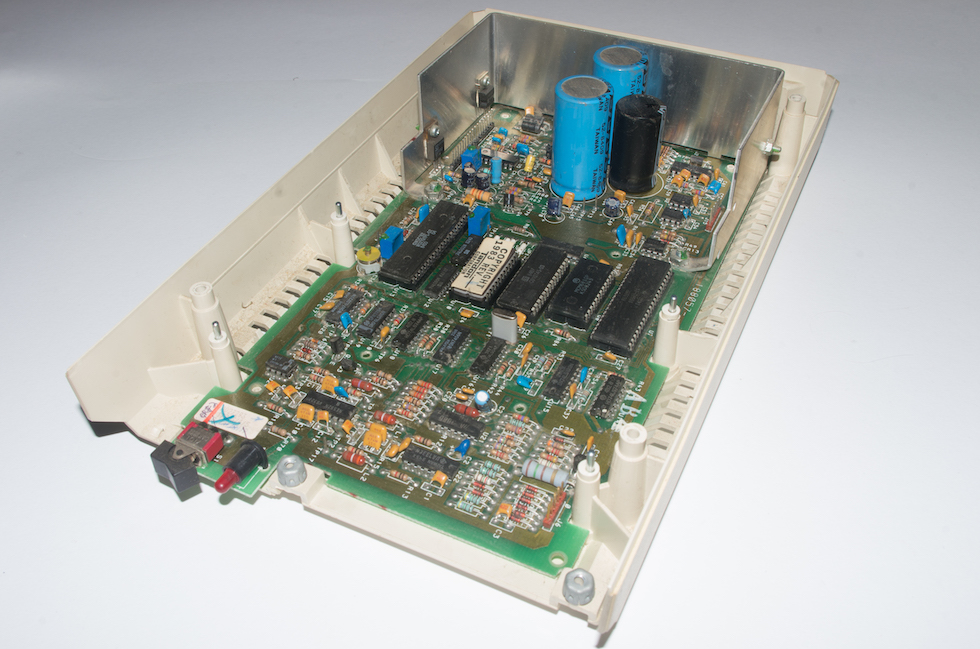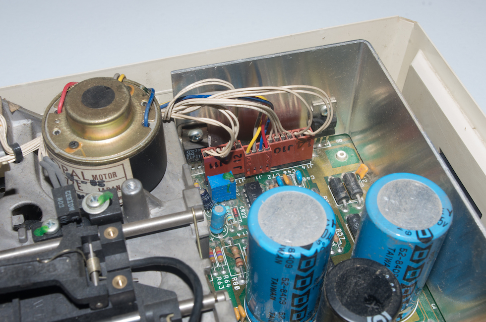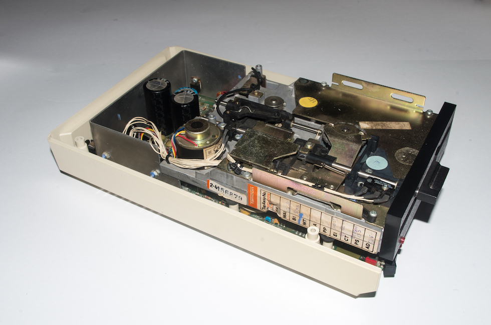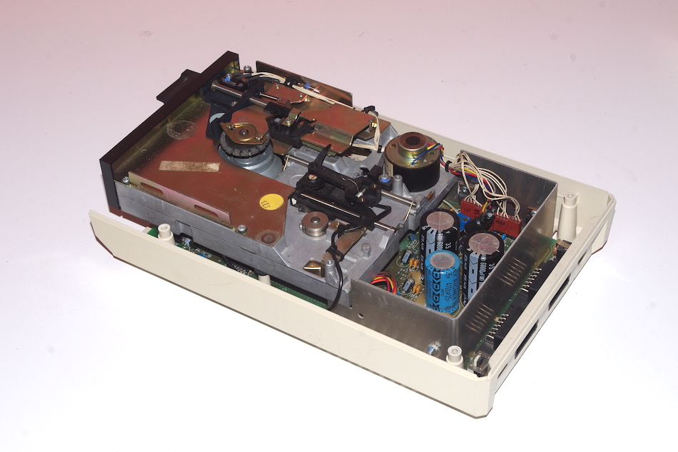 Das Laufwerk besteht aus zwei Teilen – dem eigentlichen elektromechanischen Diskettenlaufwerk von Tandon sowie der Adapterplatine mit den beiden SIO-Schnittstellen und dem Laufwerkscontroller. Fünf größere Chips sind auf der Platine zu finden: